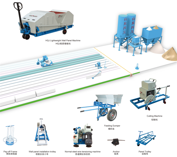 輕質墻板機設備的生產工藝簡單,設備自動化程度高,勞動強度低,流水線作業(yè),生產過程無噪音無三廢排放。墻板機設備能耗低,不需高溫、高壓,利用化學反應自身科釋放熱量,達到生產工藝要求。